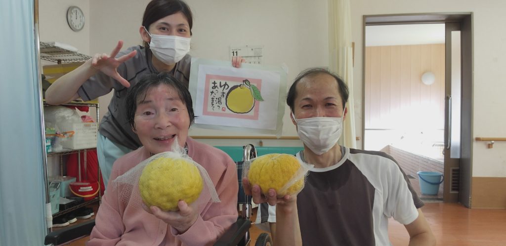 柚子(ゆず)湯って、香りが良くて、温まって、湯上りもさっぱり。利用者さんも柚子(ゆず)湯の期間を楽しみにしている方、結構多いんです。冬の利用者さんの憩いタイム。せせらぎ女池の『柚子(ゆず)湯週間』です!
