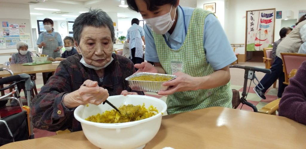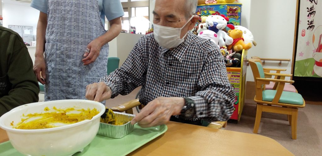 11月28日(金)は11月のおやつレクレーションの日。11月の調理メニューは「かぼちゃパウンドケーキ」。利用者の皆さんに調理の説明から入り、作業分担でコネコネ、パンパン、ギュッ。焼き上がりまでの間に漂う甘~い香りに、出来上がりを想像してニンマリ。ちょっと甘味が効いた美味しいケーキの出来上がり。皆さん、おやつタイムで美味しくいただきました。