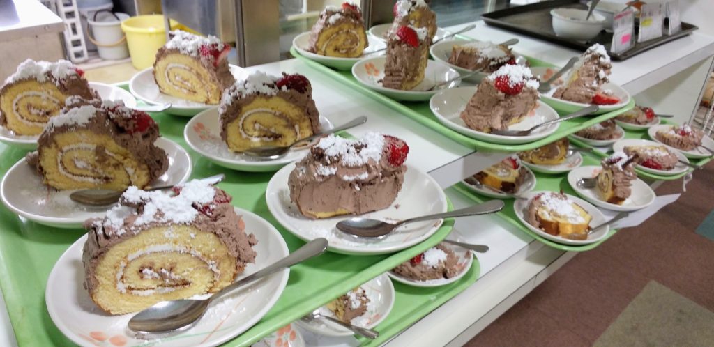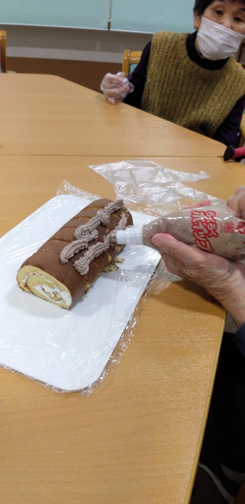 毎年、恒例ですがせせらぎ女池のクリスマス会はおやつレクレーション、通称「おやつレク」が行われ、みんなでクリスマス・ケーキを作って、おやつタイムに作ったケーキを食べます。今年のケーキはチョコレートクリームケーキ。