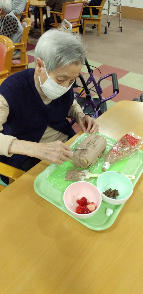 ロールケーキの生地にチョコレートクリームを塗り、さらにチョコとイチゴのトッピング。最後にパウダースノー(パウダーシュガー)をさっと振りかけて出来上がりです。おやつタイムは作ったケーキをみんなで食べて、楽しいクリスマス会。利用者さんも、職員もみんなが笑顔の楽しいクリスマス会でした。