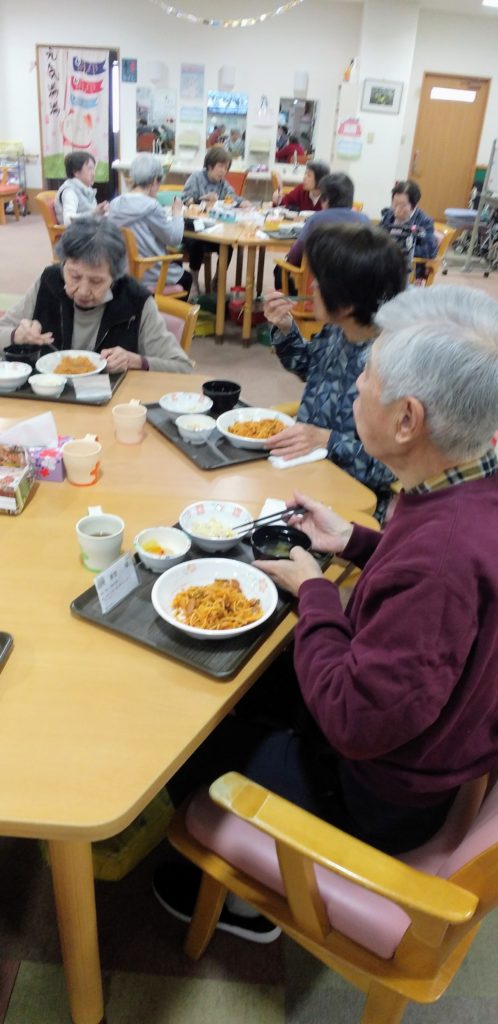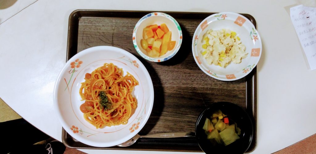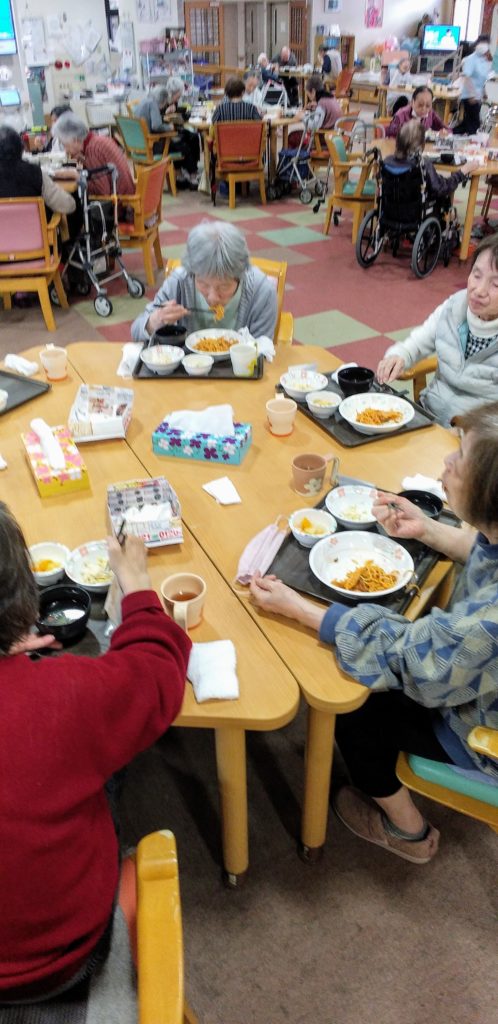 11月20日(木)、今日のお昼は「スパゲッティー・ナポリタン」。スパゲッティーといえばナポリタンだよ。って言っていただける利用者さん、結構多いんです。せせらぎ女池では意外と人気メニュー。皆さん、メニュー一つで自然と笑顔になる。そんな一時(ひととき)でした。